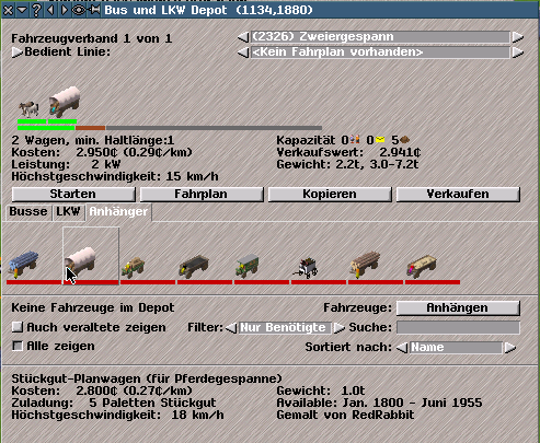 Einzelfahrzeugdepot: Im Depot sind alle derzeit verfügbaren Fahrzeuge des Depottyps nach ihrem Ladevermögen sortiert abgebildet. Mittels der Tab-Reiter sind sie nach Personen- und Postbeförderung, angetriebene und nicht angetriebene Fahrzeuge eingeteilt.