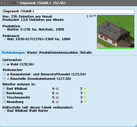 Unter dem Namensfeld findet sich die akteulle Produktion pro Monat (für 100%). Sind danben Symbole für Passagiere/post/Strom, dann kann die Produktion auch durch Transport von Arbeitern, Post bzw. Elektrizitätsversorgung erhöht werden. (Ist dies momentan der Fall, erschient das jeweilige Symbol auch im Bild der Fabrik rechts daneben.)
