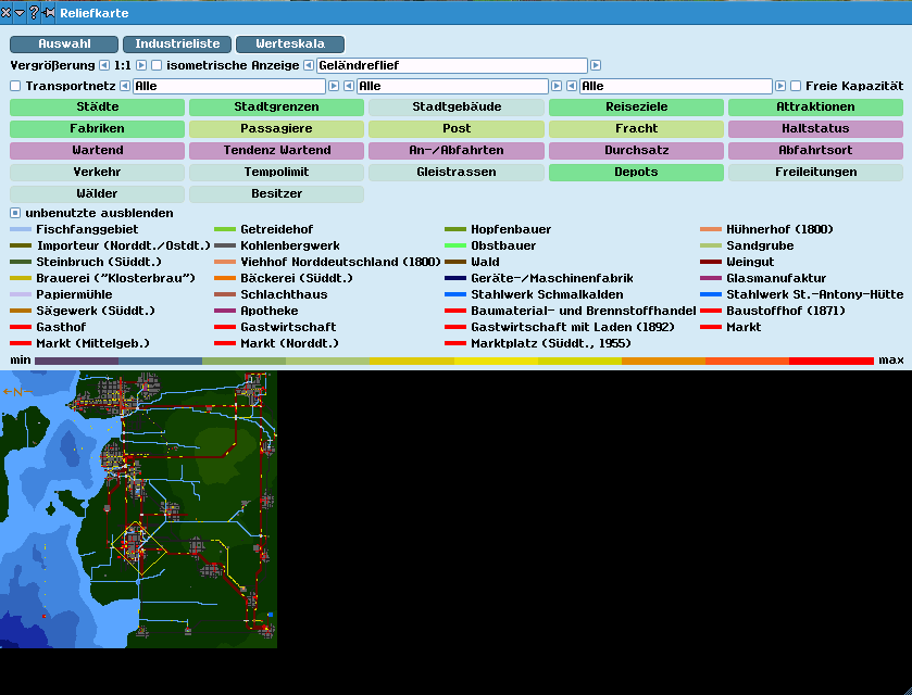 Die Reliefkarte zeigt die Welt mit allen Objekten wie Industrien, Verkehrswegen, Städten und Fahrzeugen. Du kannst schnell zu jedem beliebigen Ort auf der Karte springen, indem Du die Position in der Reliefkarte anklickst.