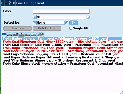 The Line List lists existing Lines (to scroll list: use slider-bar on right of list), which can be filtered by name or by transport type (click on a index-tab above list to select):