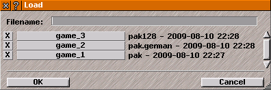 Click on name in list to re-start game; or enter name into box at top of Load: click on box, type name, & press [Enter] or [Return] or click on OK.