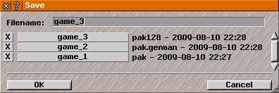 To save game to file over an old game: click on a name in list (old game is replaced by current game).