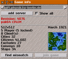 If your current game is not already an online game, it will show you a dropdown list with other servers to connect. If this list is empty, there are no servers for your pak version or program version. You can then use the show all button to see all existing servers.